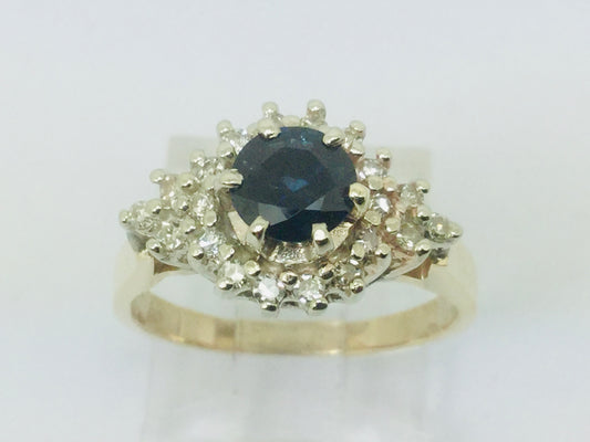 14k Yellow Gold Round Cut 65pt Sapphire & 20pt Diamond Cluster Ring