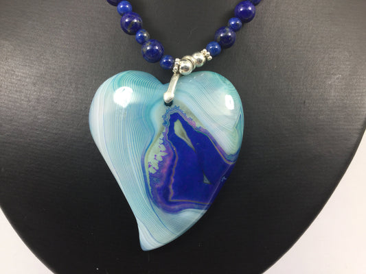 Silver Genuine Gemstone Lapis ( Stone Of Total Awareness ) / Agate Heart Shaped On Beaded Necklace Adjustable