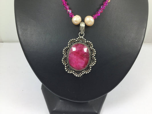 Silver Genuine Gemstone Ruby (Stone Of Nobility ) Pearl On A Beaded Necklace