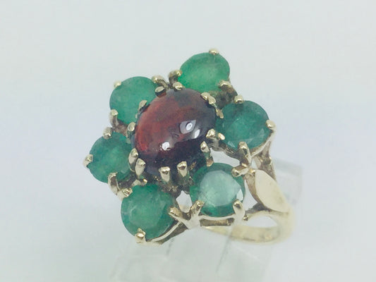 10k Yellow Gold Cabochon Garnet & Round Cut Emerald May Birthstone Floral Ring