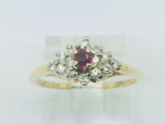 14k Yellow and White Gold Round Cut 10pt Genuine Ruby July Birthstone & 25pt Diamond Cluster Ring