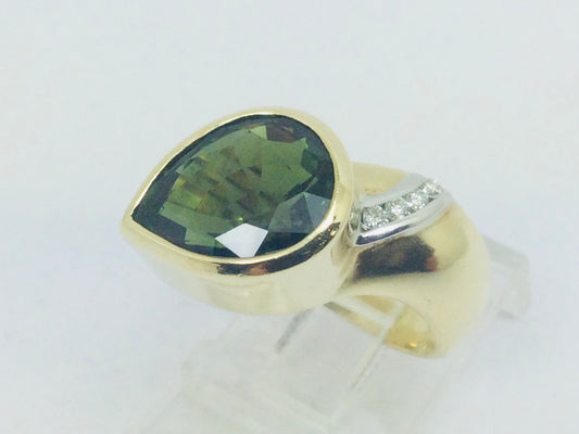 18k Yellow Gold Pear Cut 3ct Peridot August Birthstone & 6pt Diamond Accent Ring