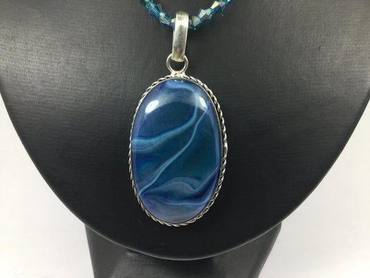 Adjustable Silver Genuine Gemstone Blue Agate On Beaded Necklace