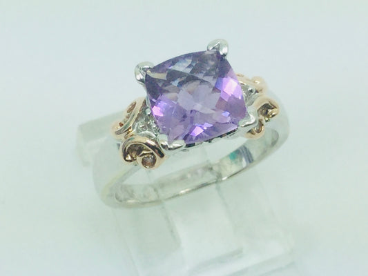 14k White Gold Cushion Cut Amethyst February Birthstone & Diamond Ring