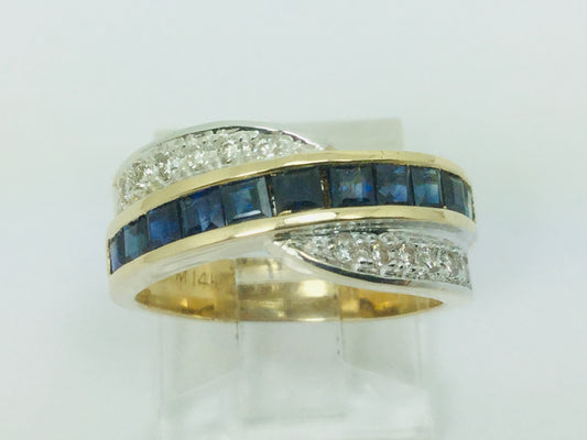 14k Yellow Gold Princess Cut 0.88ct Sapphire & 0.12ct Diamond Row Set Ring