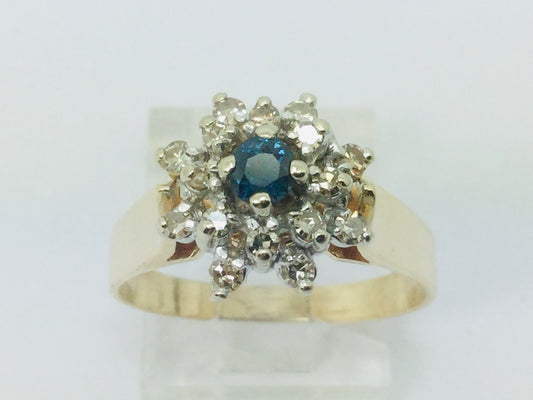 14k Yellow Gold Round Cut 0.16ct Sapphire September Birthstone & 0.32ct Diamond Halo Cluster Ring