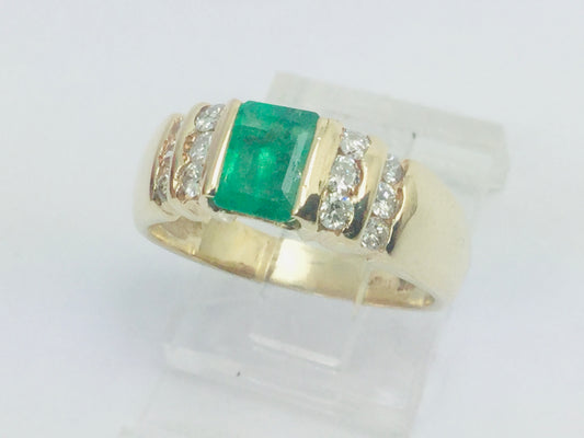 14k Yellow Gold Emerald Cut 75pt Emerald May Birthstone & 36pt Diamond Row Set Ring